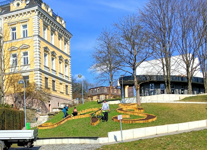 Ašské služby macešky vysazují i na jiných místech, například do záhonu pod spořitelnou na Hlavní ulici. Později přibydou i jiné druhy květin, vysazovány budou nejen do záhonů, ale také okrasných nádob.
