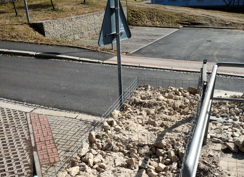 Stávající gabionová zeď u parkoviště v Příbramské ulici prošla v těchto dnech opravou. Ta spočívala v rozebrání horní sítě s oky 10 x 10 cm, odstranění nevhodné drobné frakce kameniva 0 – 32, vyrovnání zohýbaných sítí, doplnění nové frakce kameniva 64 – 120 a zakrytí novou sítí s oky 10 x 2,5 cm.