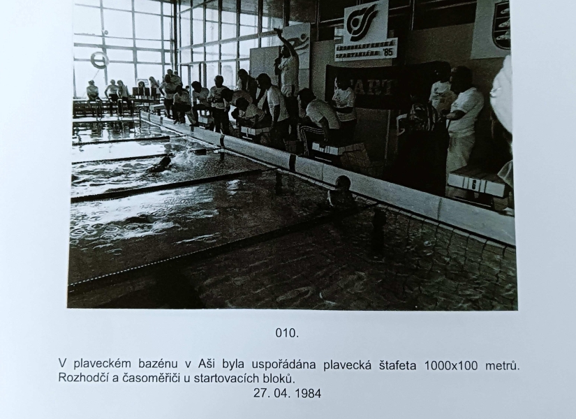Ve dnech 26. - 27. dubna 1984 se konala již druhá plavecká štafeta 1000x100 metrů. Celostátní akce se zúčastnilo 46 měst, Aš byla mezi nimi. Prvním závodníkem byl předseda národního výboru Břetislav Hadač a posledním trenér plaveckého oddílu Jiskra Aš Jiří Hudeček. Rekord minulého roku sice nebyl překonán, ale přesto se naše město v kategorii do 15 tisíc obyvatel umístilo druhé za Vysokým Mýtem.