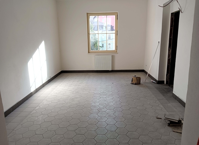 Zhruba po dvou a půl měsících jsem navštívil stavbu komunitního centra v Karlově ulici Aši, které vzniká celkovou rekonstrukcí bývalého kulturního střediska. Rekonstrukční práce se blíží do závěru a na interiéru i exteriéru budovy je to znát. Některé prostory jsou již prakticky hotové, s omítkami, výmalbou a položenými krytinami, jinde se finišuje. Například velký sál je ve fázi před pokládkou podlahy z parket, která začne už zítra.