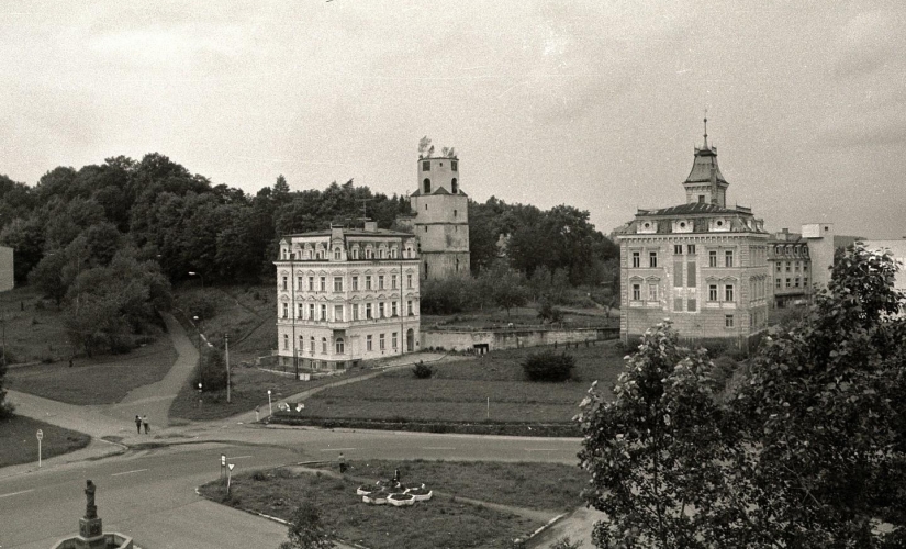 Foto: Goethovo náměstí už bez většiny budov, s torzem evangelického kostela. Foto p. Vyhnánek, pravděpodobně 80. léta.