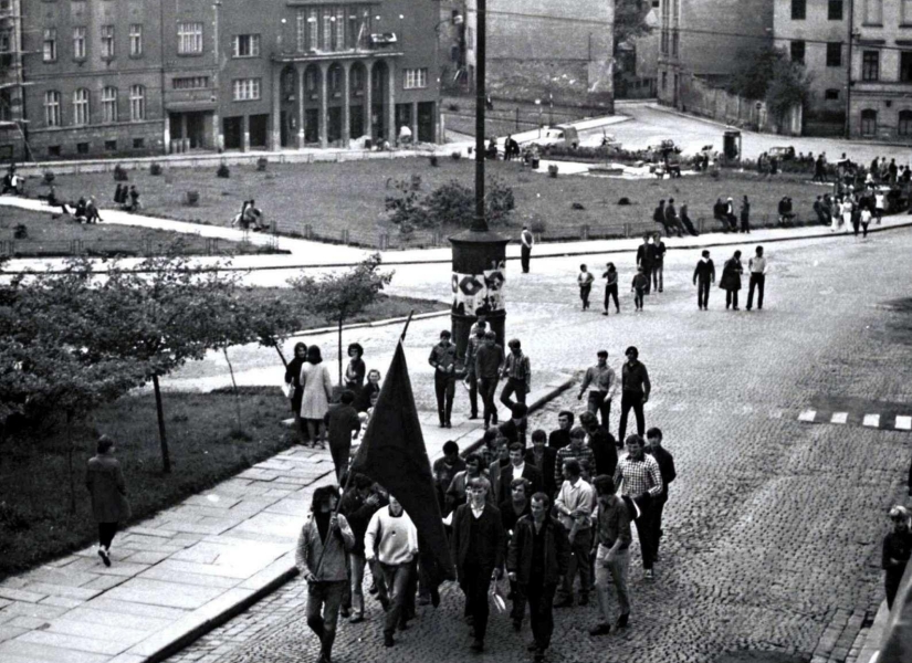 Letošní 1. máj byl obzvláště radostný, a to proto, že nebyla nakomandována účast pracujících a ani tato účast nebyla sledována. Výsledek byl imponující – průvod živelný, radostný, spontánní. Byl přejmenován Pomník rudoarmějce na Pomník padlých, protože naše město neosvobodila Rudá armáda, ale armáda USA.