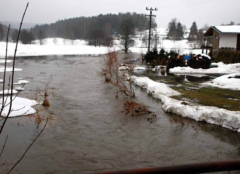 Déšť a rychlé tání způsobily problém v Doubravě, kde voda ohrožovala restauraci. Zajištěna byla pytli s pískem.
