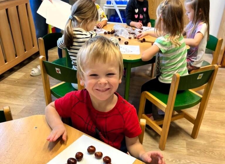Děti ze třídy Žabiček si jedno podzimní dopoledne vyrazily sbírat kaštánky. Společně hledaly ty nejhezčí a nejlesklejší. Ve třídě si pak s kaštánky hrály na mnoho způsobů – počítaly je, třídily, stavěly z nich obrázky. Děti si užily spoustu zábavy a pravou podzimní náladu!