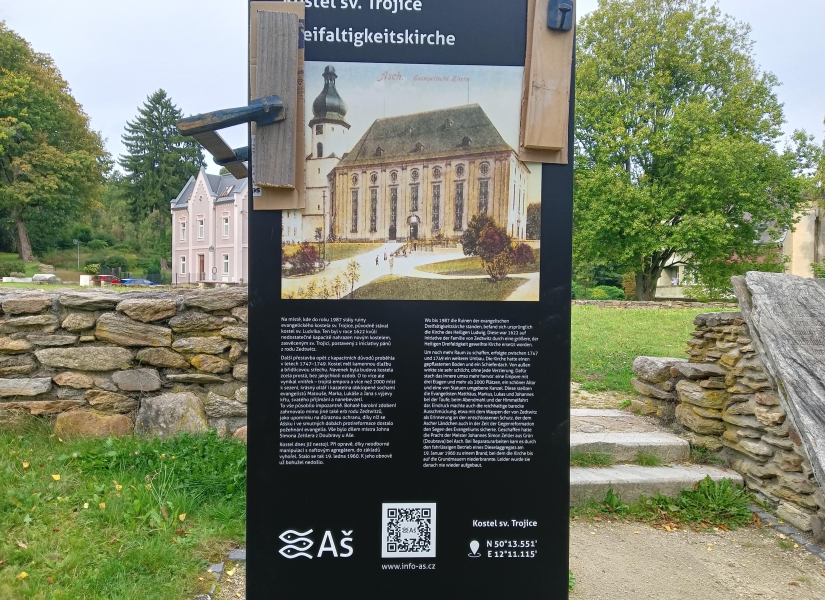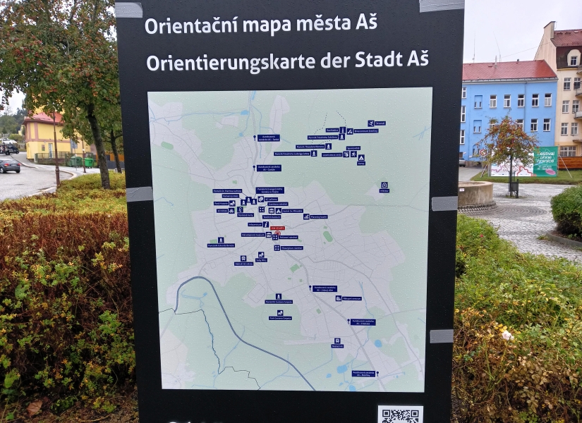 Zjednodušený text v jazyce českém a německém a méně fotografií. To jsou nové oboustranné pylony u radnice a památníku evangelického kostela sv. Trojice, které nahradily stávající informační cedule. Výměna je součástí 3., již poslední etapy výstavby nového navigačního a informačního systému pro turisty.