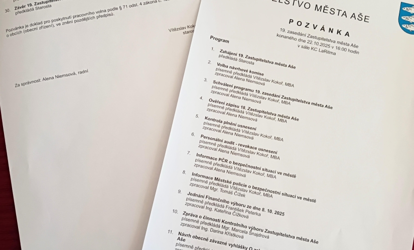 Informace o bezpečnostní situaci ve městě z pohledu policie státní a městské, nová obecně závazná vyhláška o zabezpečení veřejného pořádku v územním obvodu měst Aše, stipendijní programy pro studenty pedagogických a filozofických fakult, plán zimní údržby pro nadcházející zimní měsíce, změny v členství v osadním výboru pro Vernéřov, Horní Paseky a Dolní Paseky a informace o průběhu rekonstrukce městského bazénu. To jsou jen některé body z navrhovaného programu 19. zasedání Zastupitelstva města Aše, svolaného na 22. října 2025 od 16 hodin do Kulturního centra LaRitma.