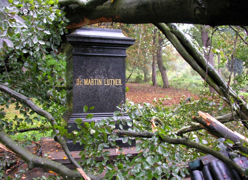V noci z pátku na sobotu 6. – 7. října 2006 spadl na Kostelním náměstí statný červený buk tak nešťastně, že zasáhl bronzovou sochu Martina Luthera, stojící zde již 123 let. Socha má poškozený obličej a Bibli, kterou drží v levé ruce. Škoda je odhadována na statisíce korun.