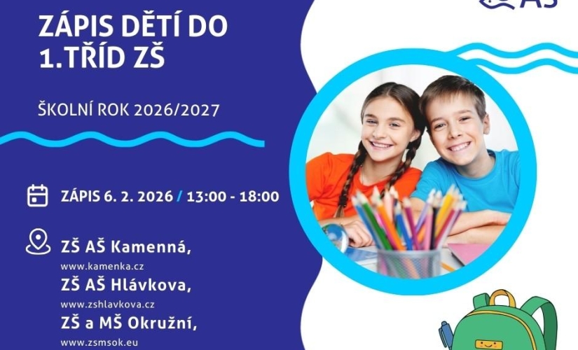 Oznamujeme rodičům, že zápis dětí do 1. tříd základních škol pro školní rok 2026/2027 se bude konat v pátek 6. 02. 2026 od 13.00 do 18.00 hodin.