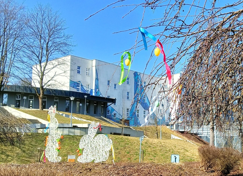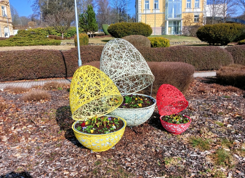 Na několika místech po Aši se nám opět po roce objevila velikonoční výzdoba. Dekorativní nádoby s jarními květinami ve tvaru velkých barevných vajec a figury zajíců jako připomínka blížících se Velikonoc (letos 5. a 6. dubna) byly instalovány například před radnicí, v kruhových objezdech v centru města atd.